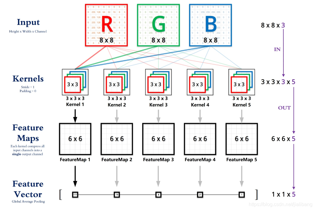 在卷积层的计算中,假设输入是H x W x C, C是输入的深度(即通道数),那么卷积核(滤波器)的通道数需要和输入的通道数相同,所以也为C,假设卷积核的大小为K x K,一个卷积核就为K x K x C,计算时卷积核的对应通道应用于输入的对应通道,这样一个卷积核应用于输入就得到输出的一个通道。假设有P个K x K x C的卷积核,这样每个卷积核应用于输入都会得到一个通道,所以输出有P个通道。
