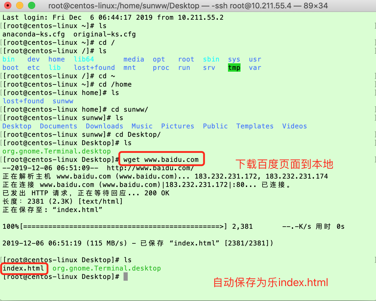 利用wget命令下载百度首页内存,自动保存为index.html,如下图所示: