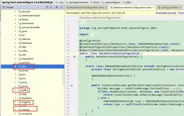 这个包又属于spring-boot-autoconfigure-2.0.4.RELEASE.jar这个包,自动配置这个包帮们引入了jdbc、kafka、logging、mail、mongo等包。很多包需要我们引入相应jar后自动配置才生效。