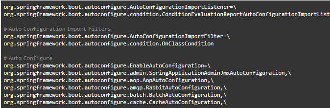下面是spring-boot-autoconfigure这个jar中spring.factories文件部分内容,其中有一个key为org.springframework.boot.autoconfigure.EnableAutoConfiguration的值定义了需要自动配置的bean,通过读取这个配置获取一组@Configuration类。