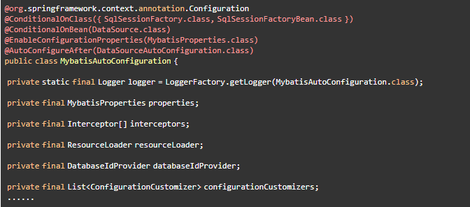 从MybatisAutoConfiguration这个类中使用的注解可以看出,要完成自动配置是有依赖条件的。