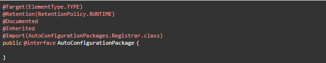 如上源码,@EnableAutoConfiguration注解引入了@AutoConfigurationPackage和@Import这两个注解。@AutoConfigurationPackage的作用就是自动配置的包,@Import导入需要自动配置的组件。