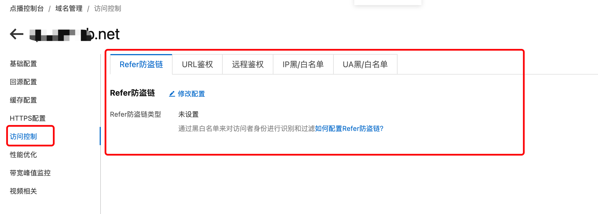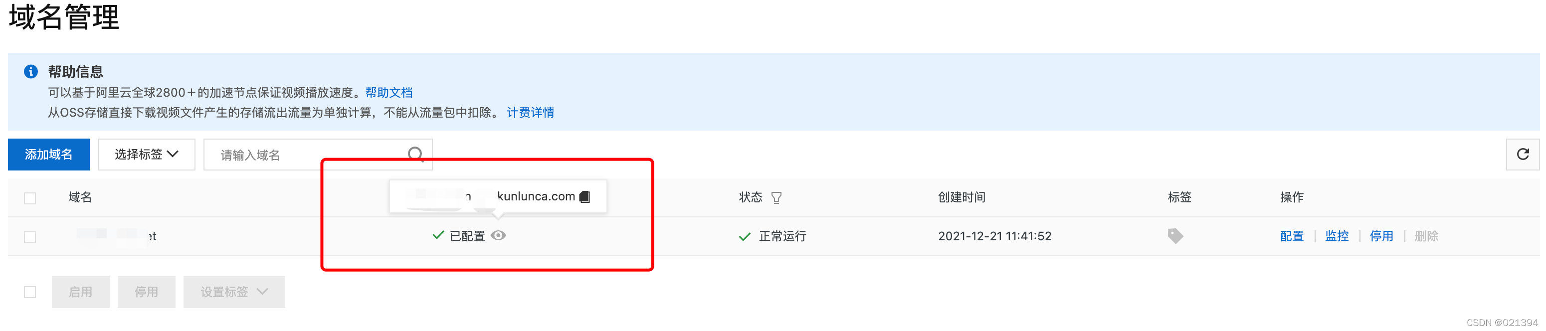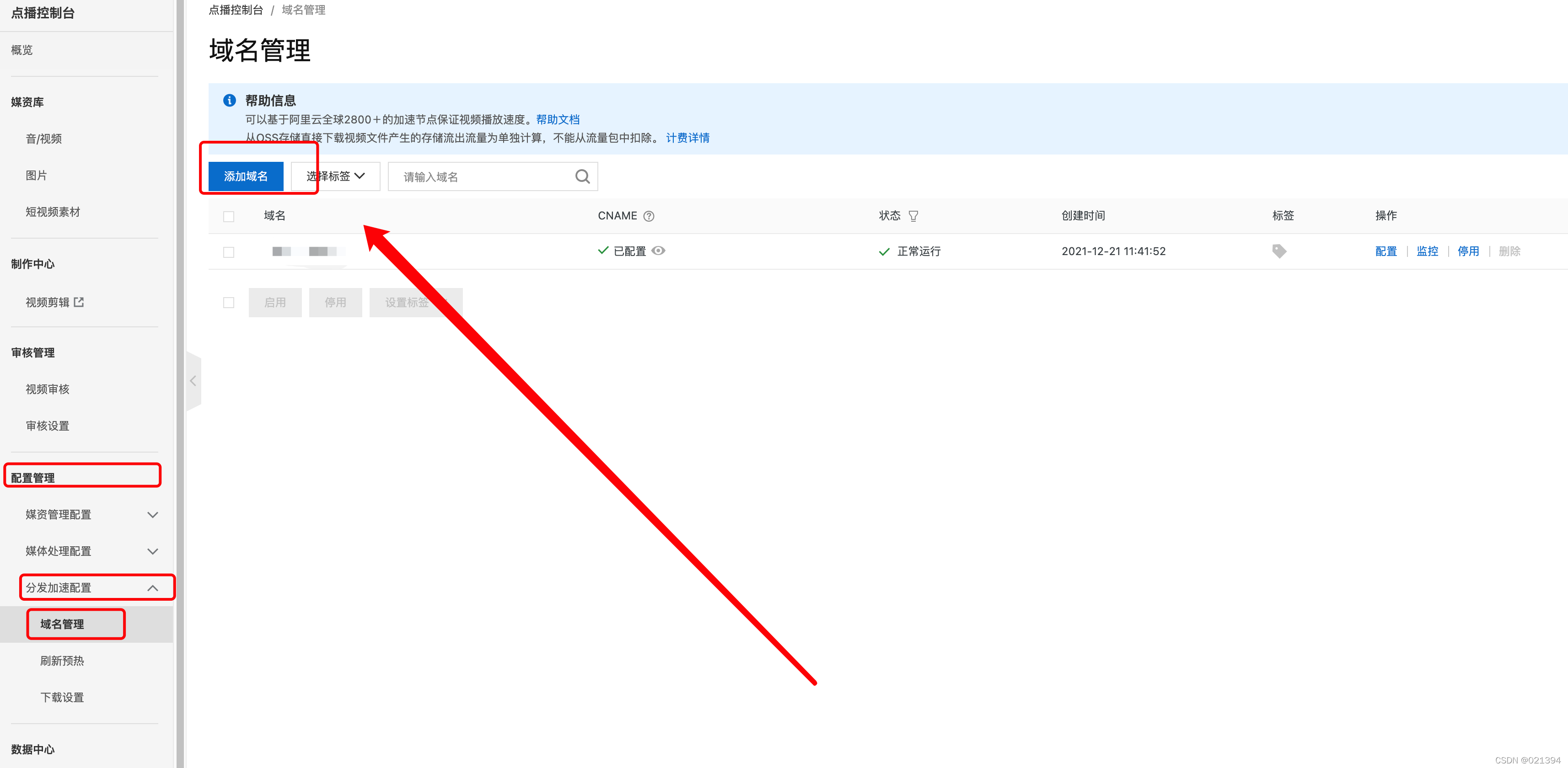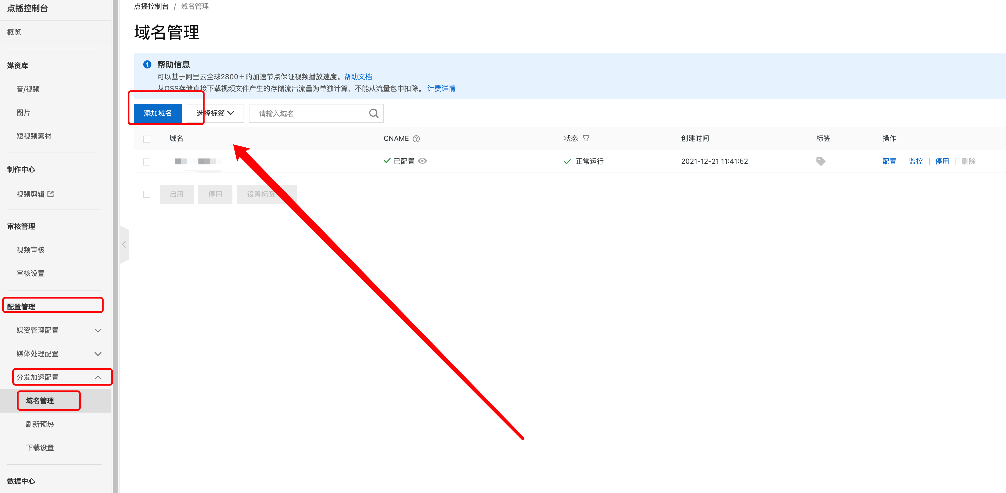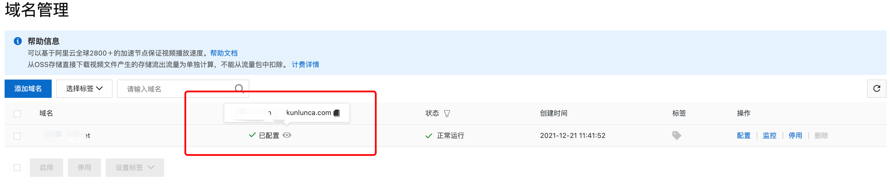 5.在域名管理页面单击配置,按需设置回源配置、缓存配置等配置