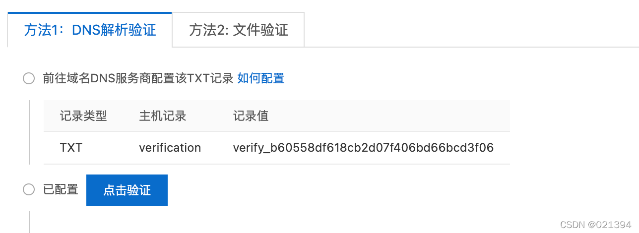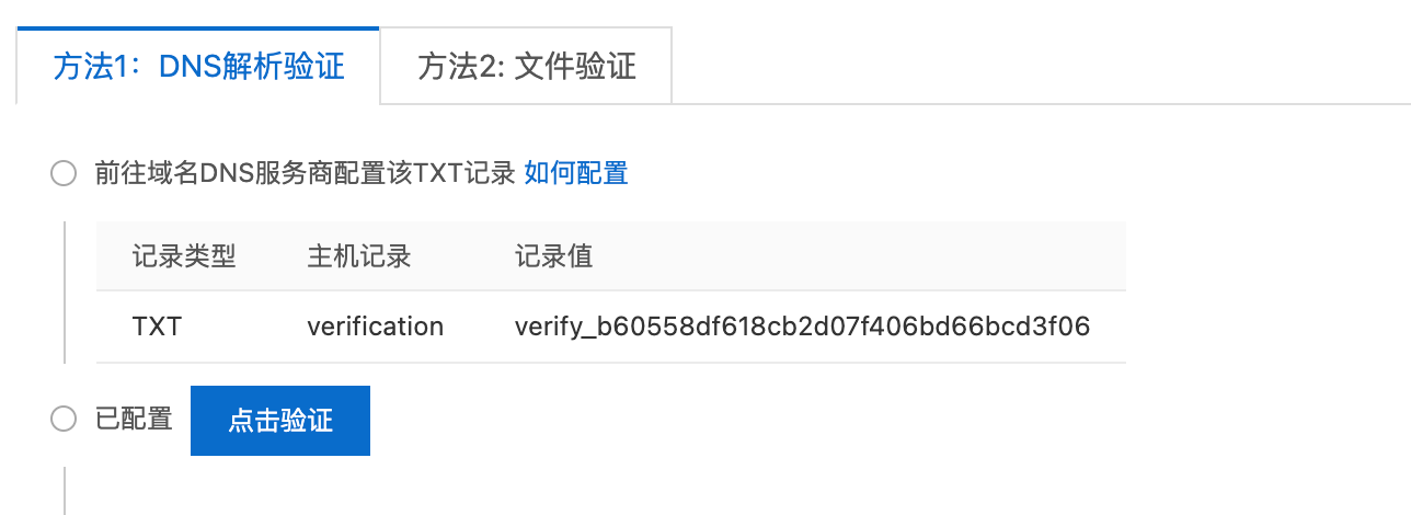 2.如果您的域名第一次在阿里云进行配置,需要验证域名归属权。选择验证方式:DNS解析验证或文件验证
