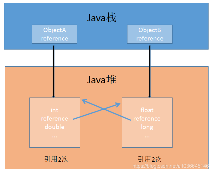 如下图,就算直接把 objectA 和 objectA都置 null,但在 Java 堆中的这两对象内存依然保持着互相引用而无法回收。