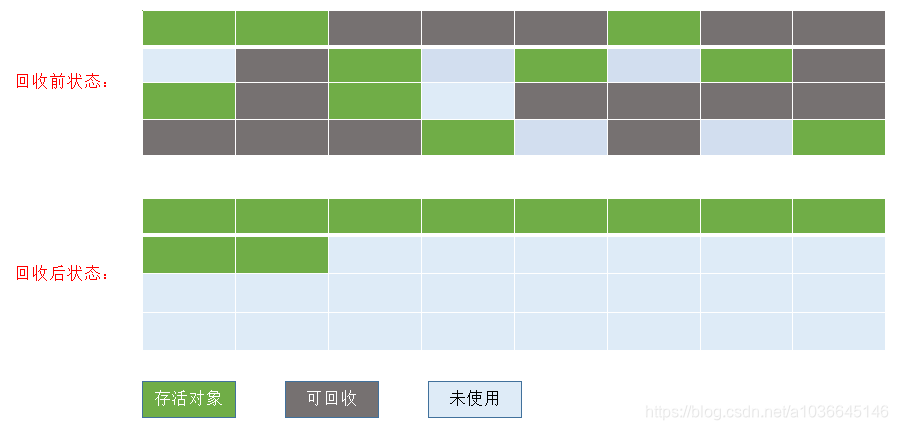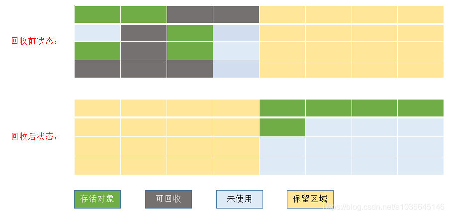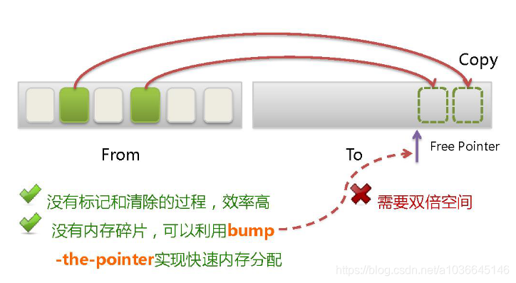 它可将可用内存空间分成大小相等的两块,每次只使用其中一块。当这块内存使用完时,在触发GC时,就会将还存活的对象复制到另一块上面,并将已使用过的内存清除掉。
