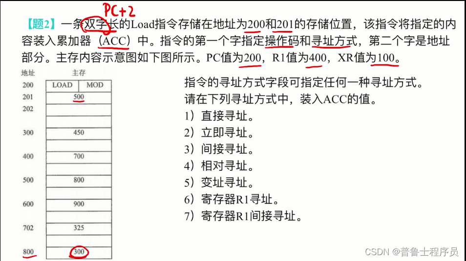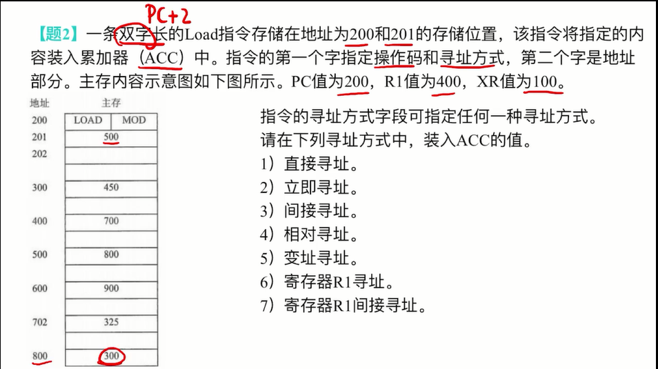 3)间接寻址:通过形式地址500找到有效地址800,最后通过有效地址800找到操作数300