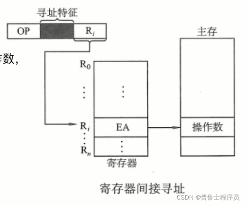 类似于间接寻址,寄存器间接寻址是寄存器给出操作数的在主存中的地址,即EA={Ri}