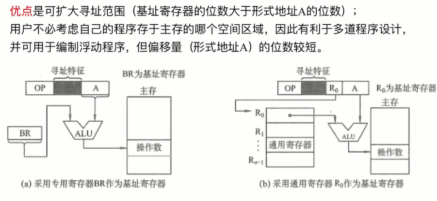 将CPU中的基址寄存器(BR)的内容加上指令格式中的形式的地址A得到操作数的有效地址
