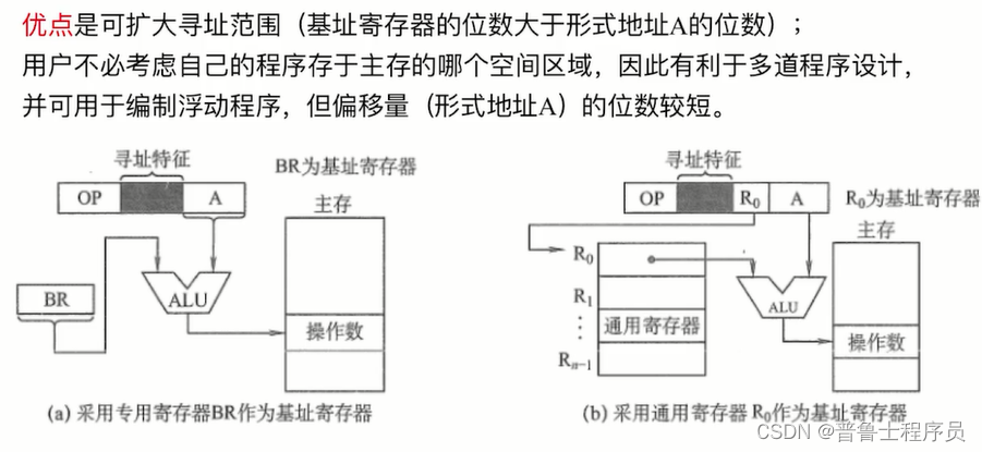 基址寻址面向系统,用于多道程序或数据分配存储空间。