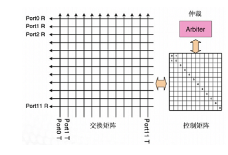 如图所示,每一条输入链路和输出链路都有一个CrossPoint,在CrossPoint处有一个半导体开关连接输入线路和输出线路,当来自某个端口的输入线路需要交换到另一个端口的输出点时,在CPU或交换矩阵的控制下,将交叉点的开关连接,数据就被发到另一个接口。