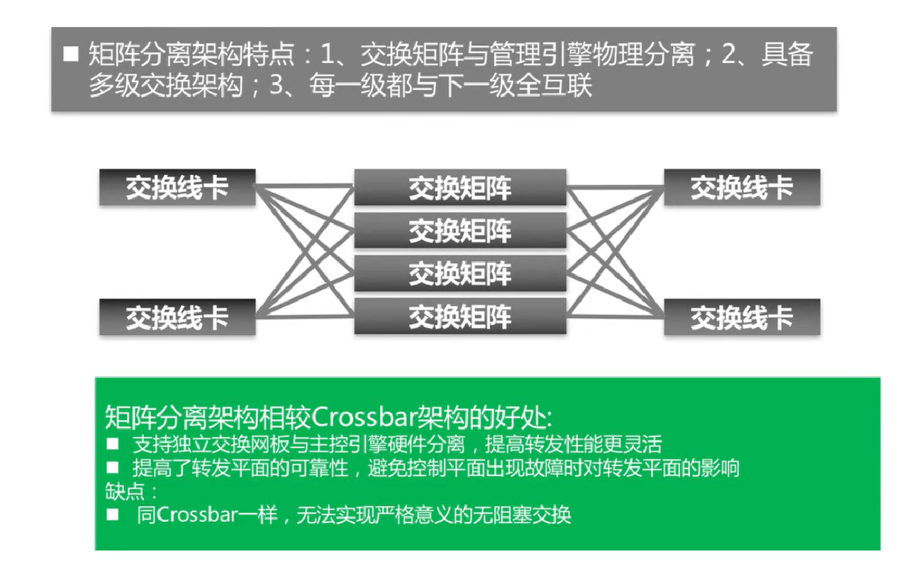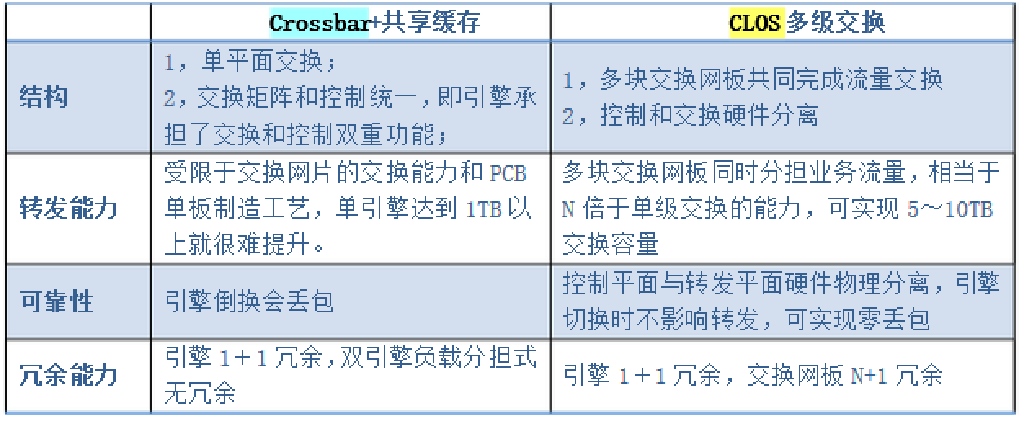 基于CICQ的Crossbar同时满足了较大容量交换和较好的业务调度的需求,是一种比较完善的交换架构,交换容量可以从几百G到几T,通常支持10G接口但无法支持40G和100G接口。由于交换容量不是很大,交换网通常集成在主控板上,采用1+1主备或负荷分担工作方式。
