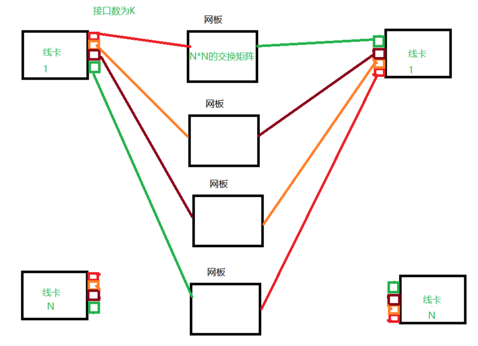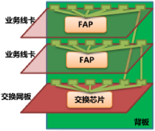 线卡和线卡之间通过背板直接相连。每两两线卡之间都通过背板走线相连。典型为两级交换架构,即 LC<--->LC。