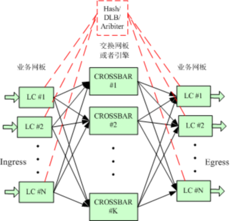 包含一到多个并行工作的Crossbar芯片,业务线卡通过背板走线连接到Crossbar芯片上,Crossbar芯片集成在主控引擎上。业务调度和均衡通常采用集中仲裁或者Hash方式