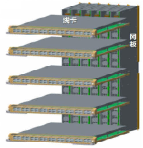 如图1所示,非正交背板结构,业务线卡与交换网板互相平行,板卡之间通过背板走线连接。因为背板走线会带来信号干扰,背板设计也限制了带宽的升级,同时,背板上PCB的走线要求很高,从背板开孔就成了奢望,这直接导致纯前后的直通风道设计瓶颈一直无法突破。所以背板带宽限制了带宽的升级,同时也增加了散热的难度。