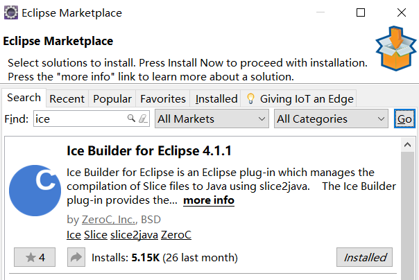 - 打开Eclipse,找到help->Eclipse Marketplace,搜索ice,安装ice-builder插件