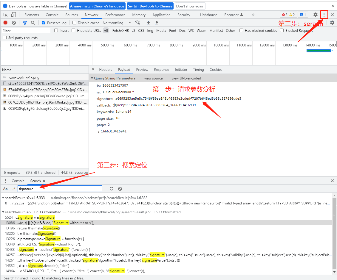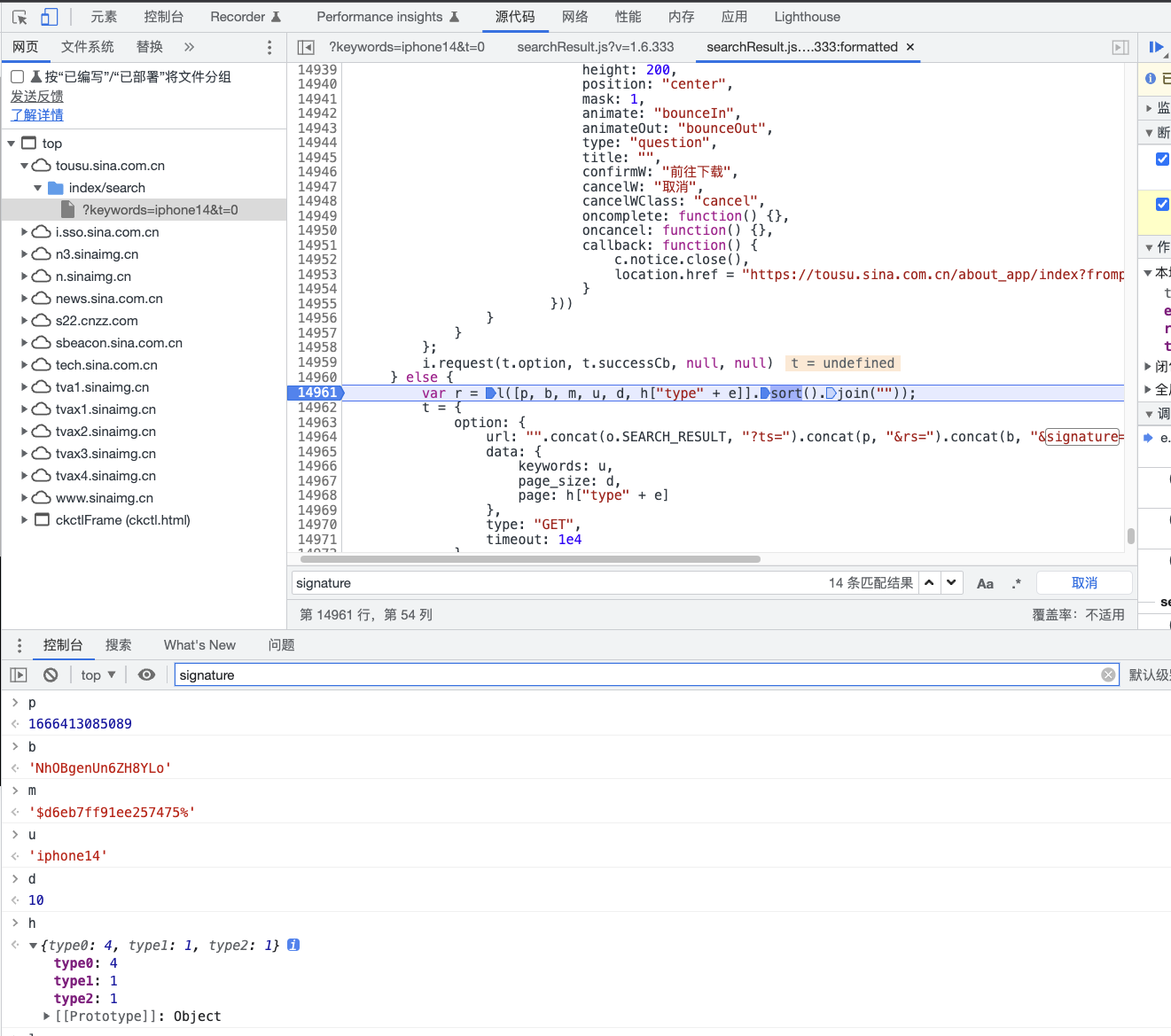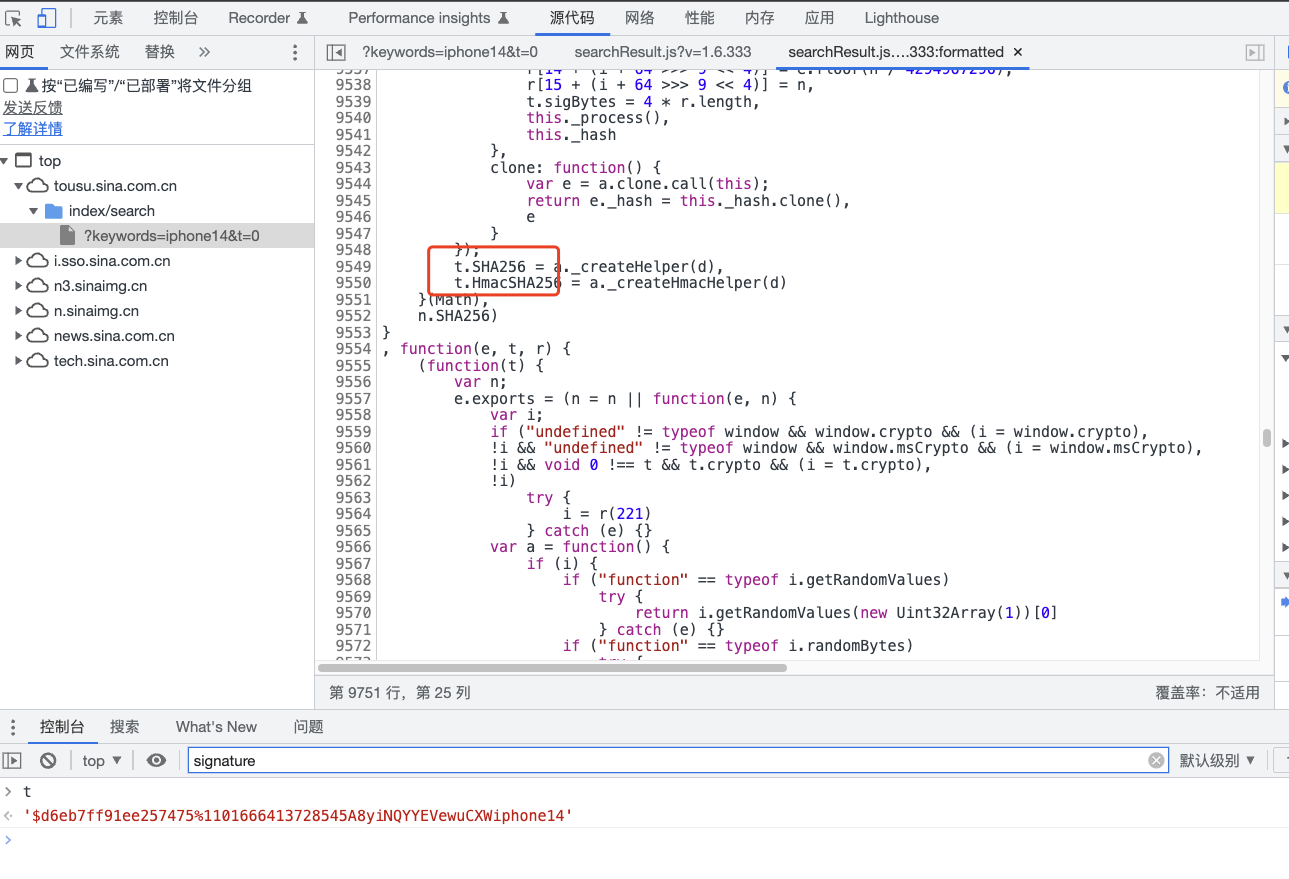 进入searchResult.js文件后继续输入signature进行二次搜索