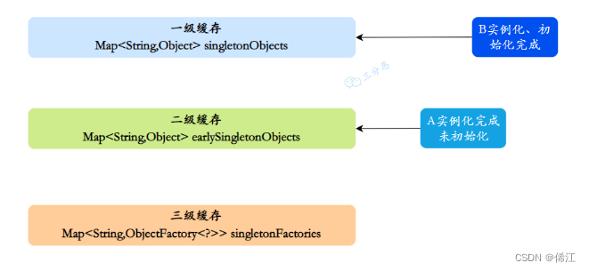 3.同样,B注⼊属性时发现依赖A,它就会从缓存里找A对象。依次从⼀级到三级缓存查询A,从三级缓存通过对象⼯⼚拿到A,发现A虽然不太完善,但是存在,把A放⼊⼆级缓存,同时删除三级缓存中的A,此时,B已经实例化并且初始化完成,把B放入⼀级缓存。