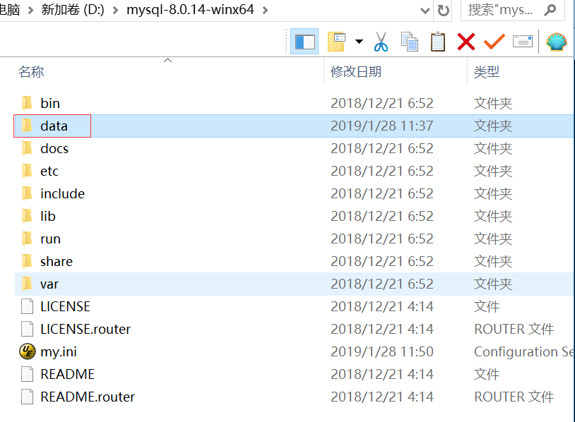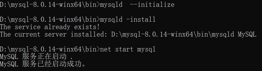 4.重启之后,重新以管理员身份cmd进入控制台,切换到mysql的bin目录下( D:\mysql-8.0.14-winx64\bin ),顺序输入如下命令