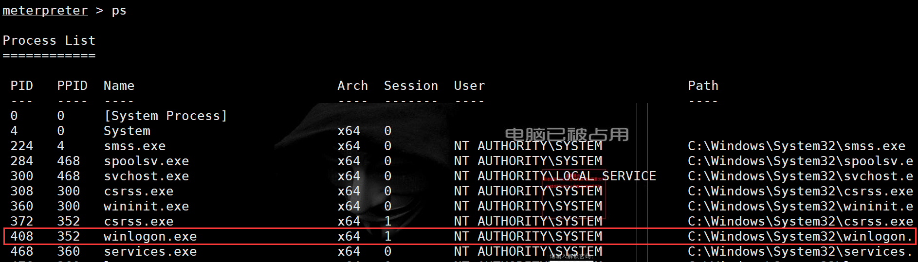 使用 ps 命令查看进程,我们需要找一个 64 位的进程,并且用户是 NT AUTHORITY\SYSTEM ,因为迁移进程后,meterpreter的权限是迁移进程的权限。这里我们选择408进程