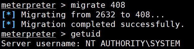 执行进程迁移命令,将meterpreter进程迁移到408进程:migrate 408