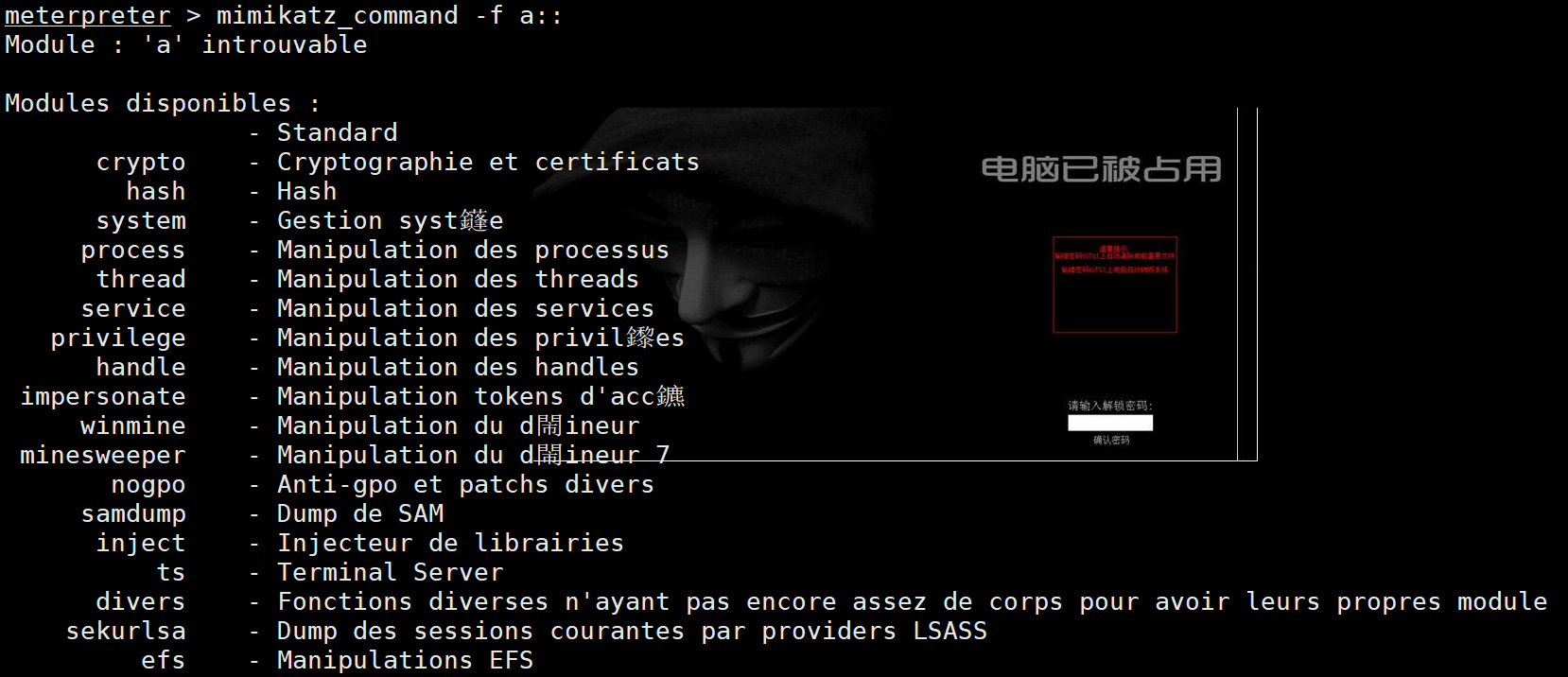 mimikatz_command模块可以让我们使用mimikatz的全部功能。首先我们加载一个不存在的 a 模块,让其报错,于是可以显示出mimikatz_command模块的所有功能。命令: