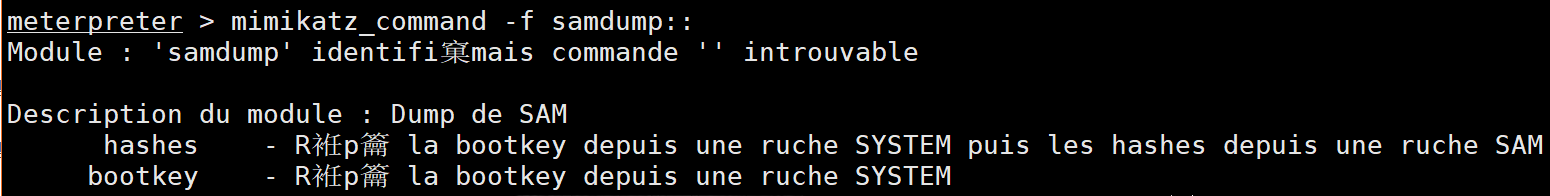 我们选择samdump模块,查看该模块下的功能:mimikatz_command -f samdump::