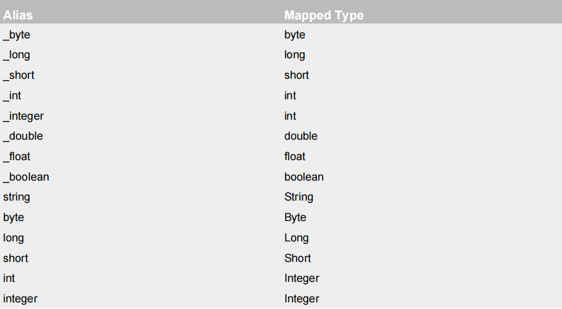 MyBatis —— 7、默认类型的别名MyBatis 中有为 java 自建的类型别名,这些别名大小写不敏感,别名可以从官方文档的 Configuration XML 获取(第15页)。注:左列是别名版权声明:本文为Mr_zhangyj原创文章,遵循CC 4.0 BY-SA版权协议,转载请附上原文出处链接和本声明。原文链接:https://blog.csdn.net/Mr_zhangyj/article/details/123515597