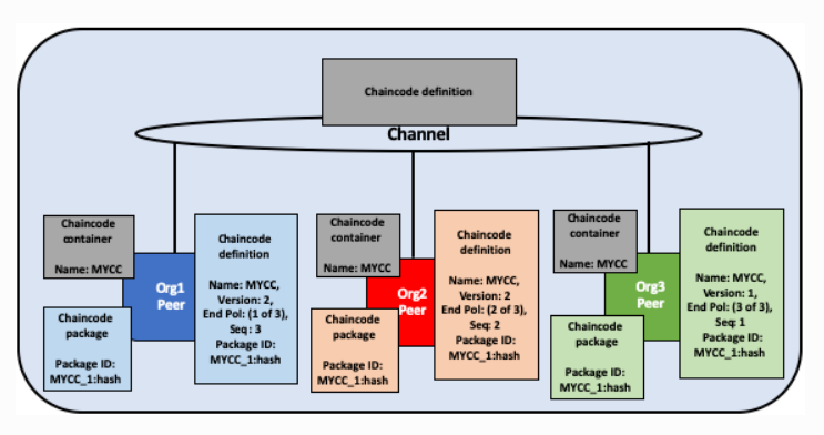 每个组织在批准链码定义时可以使用不同的packageID。这允许通道成员安装使用相同背书策略的不同链码二进制文件,并读写相同链码名称空间中的数据。