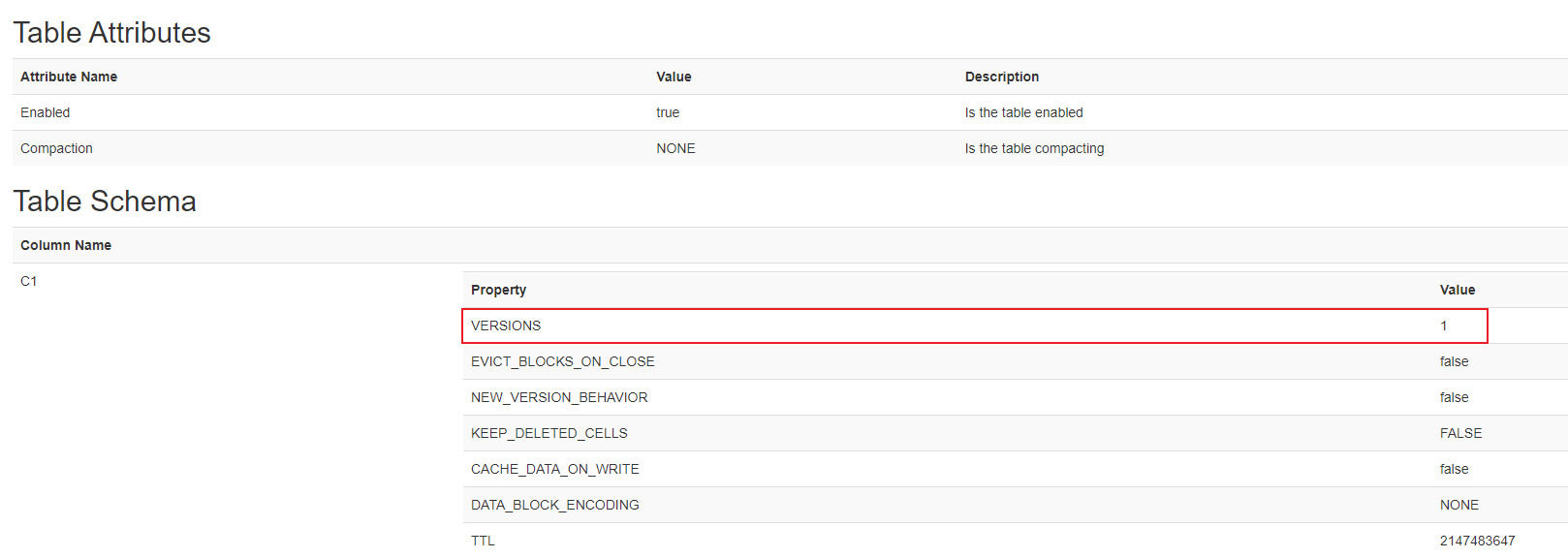 {NAME => 'C1', VERSIONS => '1', EVICT_BLOCKS_ON_CLOSE => 'false', NEW_VERSION_BEHAVIOR => 'false', KEEP_DEL