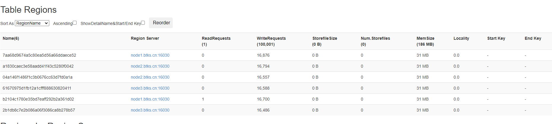 每个region都有两个重要属性startKey、endKey,默认是空的,没有边界,都存储在一起。region中rowkey按照字典序存储。但是当数据越来越大时,region将会分裂,读取一个中间值,进行分裂。