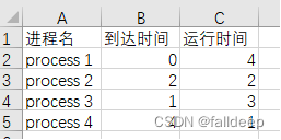 process[4].arriveTime = 4, process[4].runTime = 1, process[4].name = "process 4";