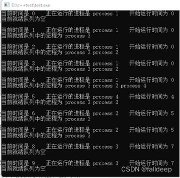 通过对比可以发现,程序运行正确,并且程序还可以输出,每一秒运行的状态,参数包括正在运行的进程名,开始运行时间,及当前就绪队列中的进程名
