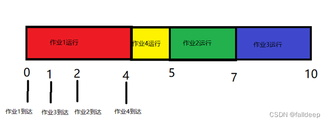 根据计算,根据先到先服务算法,得出作业的调度流程图
