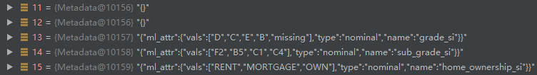 }下图为:经过MLlib特征工程 处理后列的MetaData包含ml_attr和特征处理相关的数据元,未经特征工程处理的MetaData则为空,查看方式df.schema.fields(_.metadata)