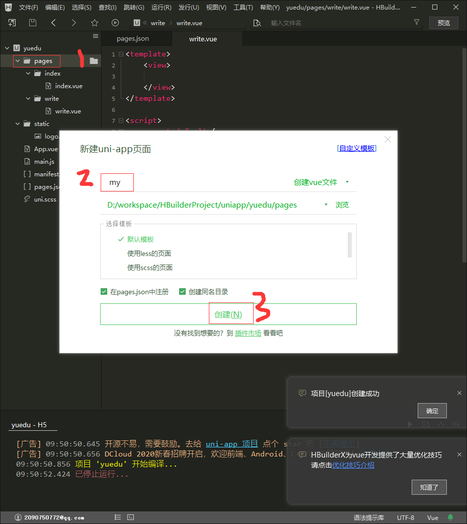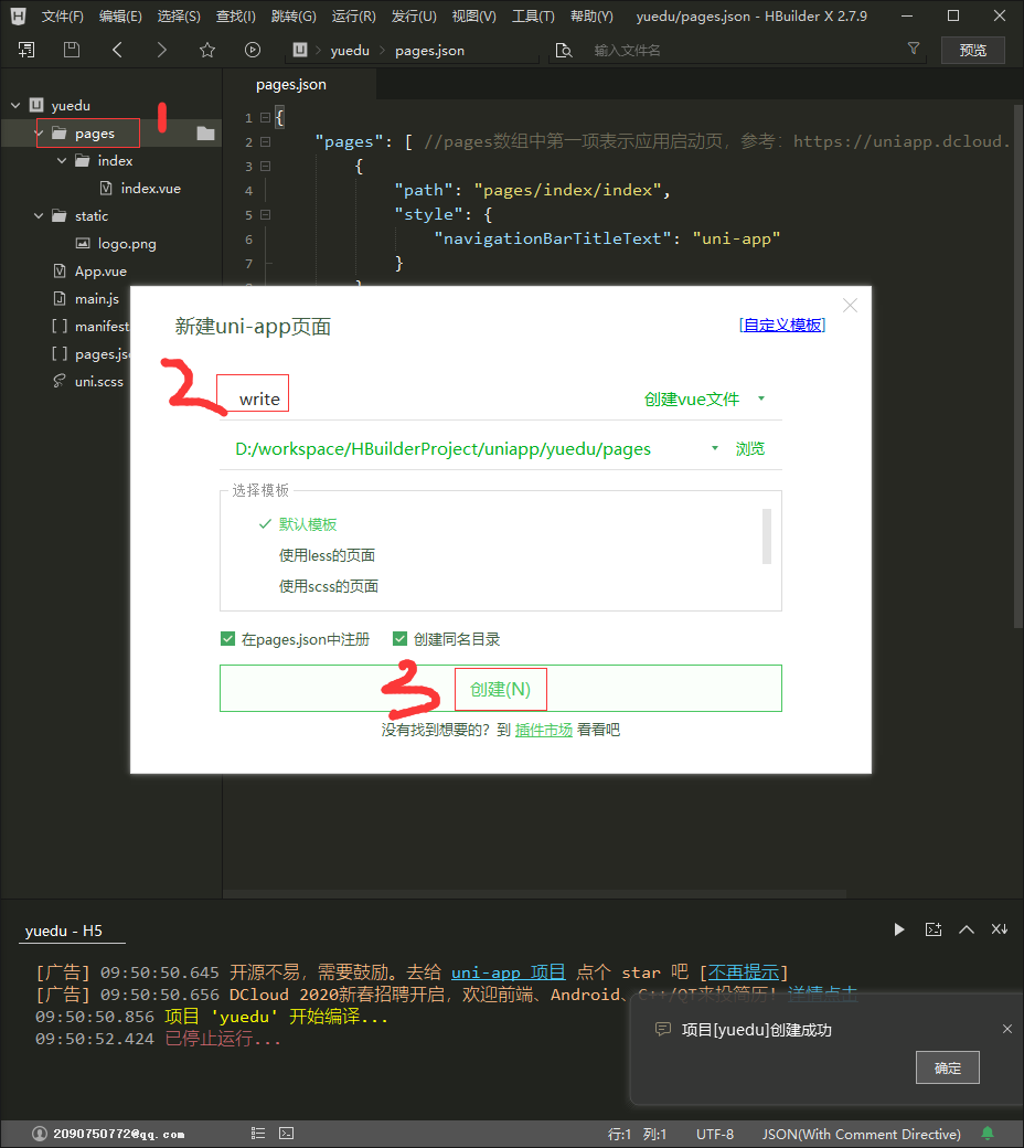在pages下面创建页面:写作页面,用户提交文章的页面