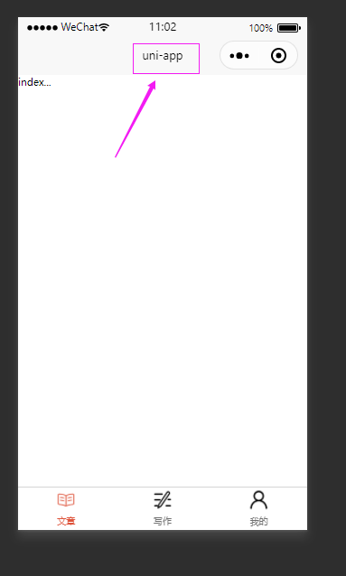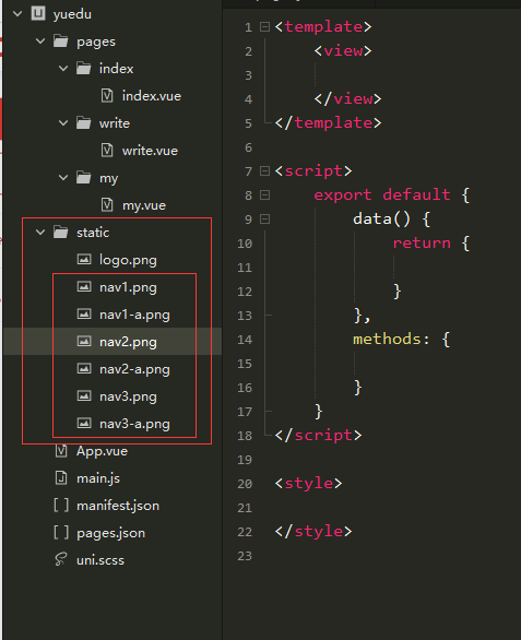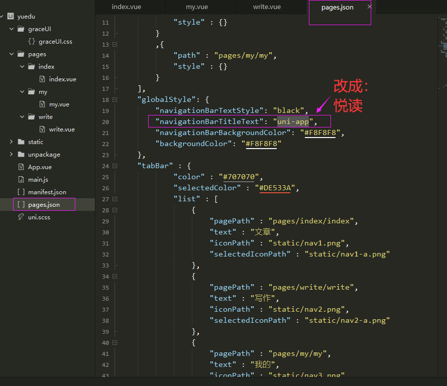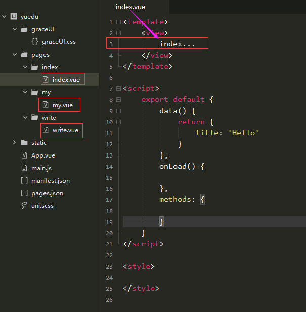 修改index.vue、my.vue、write.vue这几个文件。清理一下。如下图。然后每个页面的view里面写上那个页面的名字...暂时起到一个页面内容的作用