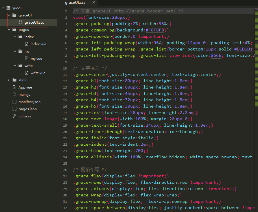 |_ graceUI.css我们可以把资料中的【graceUI】这个目录复制粘贴到项目里。里面是一个css文件: