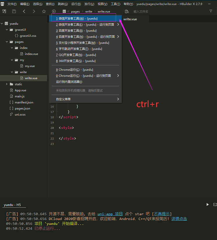 保存好了之后:按ctrl+r运行:然后:选微信开发者工具进行调试(如果没有安装微信开发者工具的,需要先安装再使用)