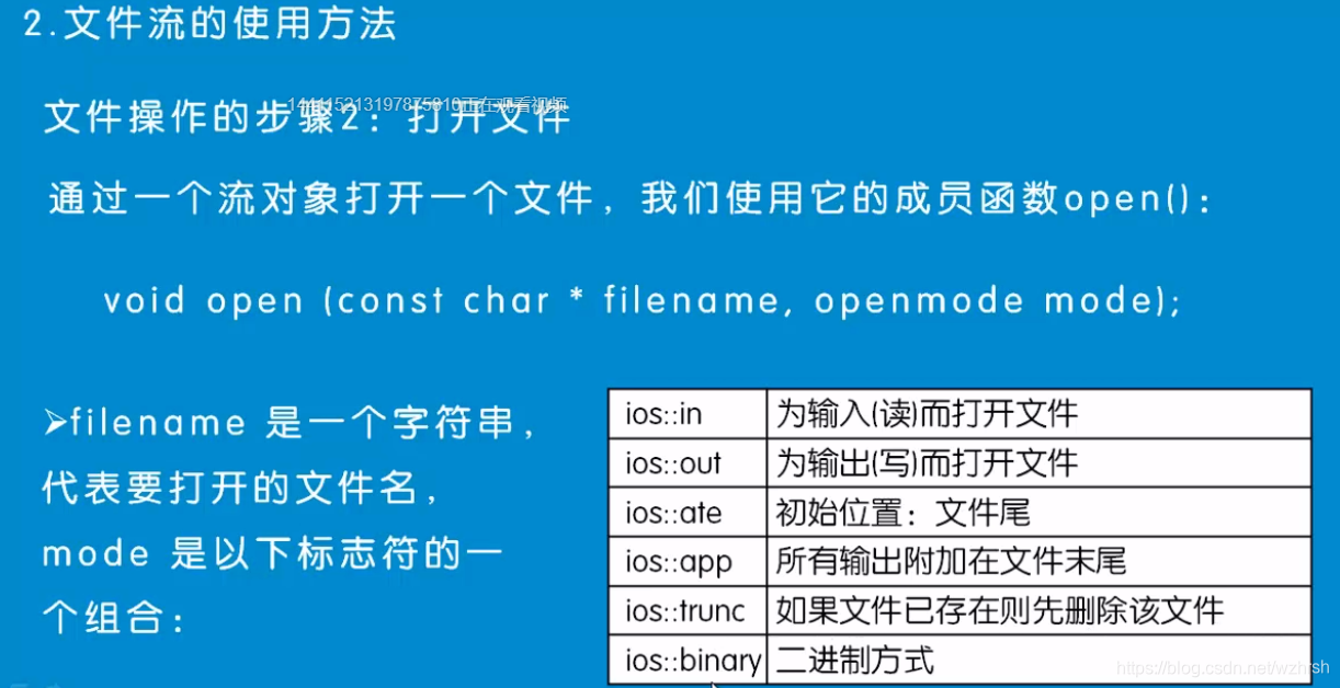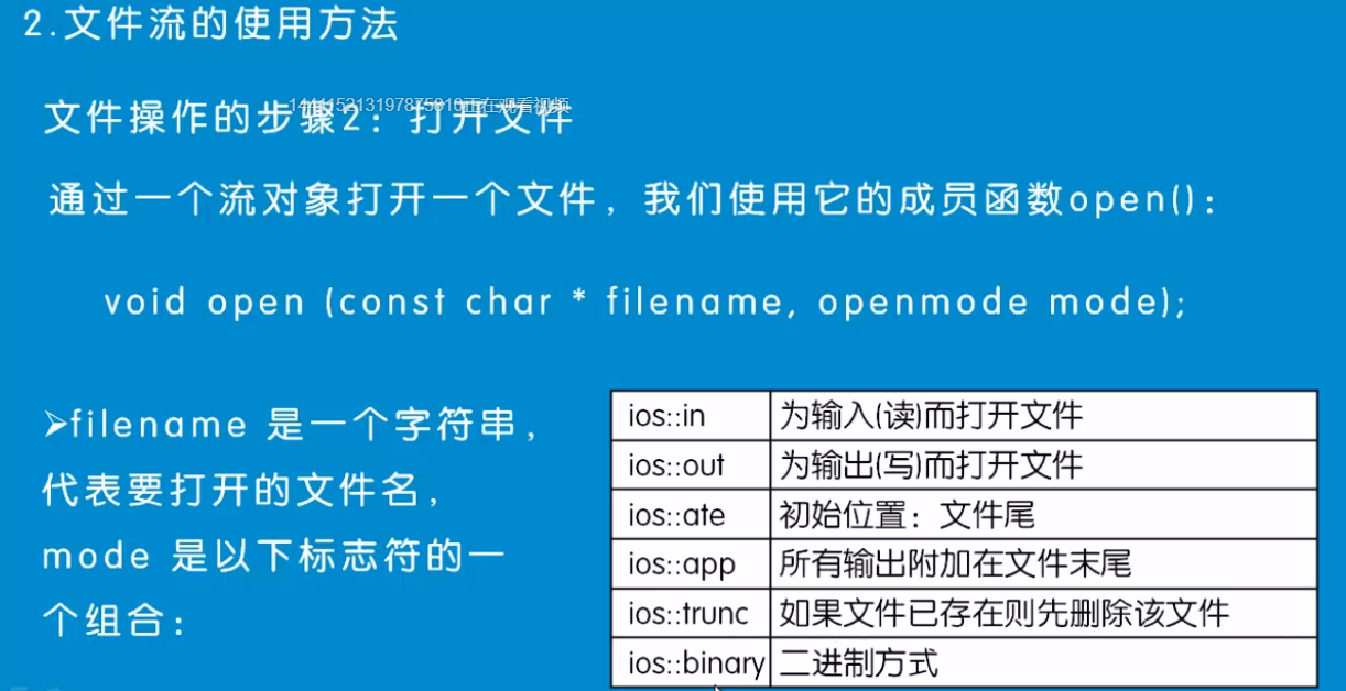 fstream iofile("welcome.txt", ios::in | ios::out);//fstream 读写操作,对打开的文件可进行读写操作