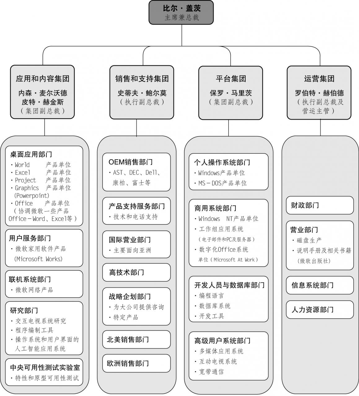 在平台集团内部,由个人操作系统部门生产Windows和MS-DOS这两个系统。商用系统部门则负责Windows NT与OLE(对象链接和嵌入)技术的开发,它还包含一个独立的产品单位以开发工作组应用软件(负责电子邮件及PC机服务器系统)。开发人员及数据库系统部门开发编程语言(如Visual Basic)、编程支持工具以及数据库产品(如Access和FoxPro)。高级用户系统部门下辖互动电视系统、宽带通信及多媒体应用技术等几个子部门。在应用和内容集团,桌面应用程序部门下设有Office产品单位。它负责监督Word与Excel产品单位并与图形产品单位(PowerPoint)紧密合作,以使这三个产品能够在Office应用软件套装中更好地协调工作。这个部门同时也生产Project这种流行的项目管理工具。用户服务部门包括“微软家用软件”产品组,负责生产家庭理财软件(Money)以及为家庭娱乐和教育设计的多媒体应用软件;同时也生产一款名为Works的套装软件,它集文本处理、电子表格以及数据库功能于一身,主要提供给初学电脑的人使用。联机系统部门开发和管理新的微软网络产品。研究部主要负责探索新的产品和程序设计技术,并与其他各产品组紧密地协同工作(参照附录2、3中关于微软主要应用产品与操作系统的描述)。