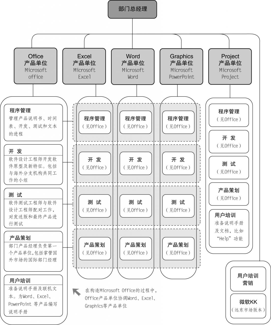 单位,每个产品单位一般都设有五个职能小组,每个小组都由独立的经理管理,他们分别负责程序管理、开发、测试、产品策划(由委派到产品组的产品经理负责)及用户培训。微软会将这些小组按照其生产的产品划分为几个区域。例如,在Office产品单元成立之前,Excel单位的开发人员被划分到五个小组中:重算/功能、图表、打印/格式化,加载项(一种特殊的软件程序,可用于统计分析或拼写检查等)和宏/转换。进行用户培训时某些产品单位会将他们的小组集合,以准备培训手册和联机文档(例如Help菜单的撰写)。在桌面应用部门,由Office产品单位的用户培训小组来为Word、Excel和PowerPoint准备培训手册。与此同时,在开发组内还包含另外一些小组,他们与微软的海外分支机构一起准备产品的非英语版本,而产品管理组一般都有国际化经理来主管国外的市场销售。例如,微软在日本有一个分部(K.K.),主要负责制作日文、中文及朝鲜文版本的桌面应用软件,该分部直接向部门经理负责。