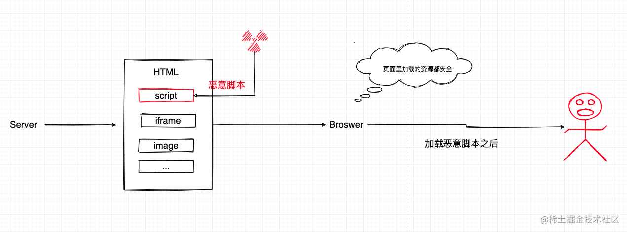 而一旦这些资源里有恶意的脚本,浏览器无法识别哪些是恶意的脚本,还是认为都是安全可加载的,而导致悲剧的发生