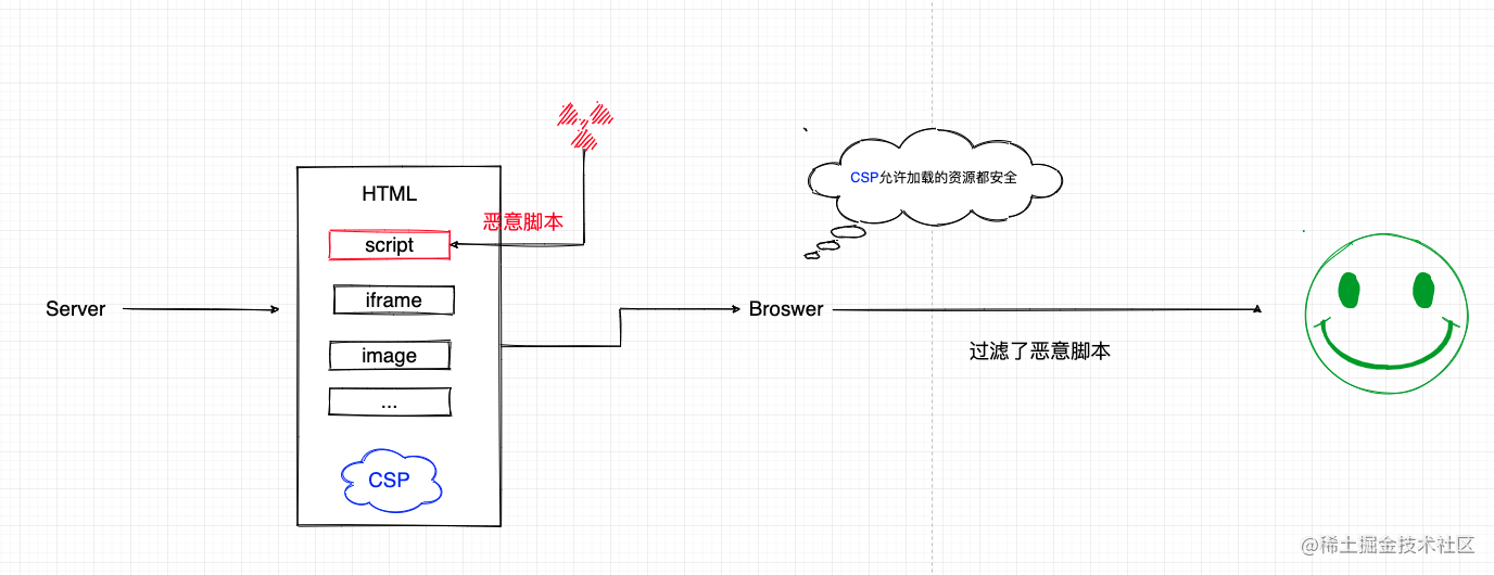 当我们加了CSP配置,告诉浏览器哪些是安全可加载的,那么那些恶意脚本就会被过滤掉,达到了防止攻击的效果