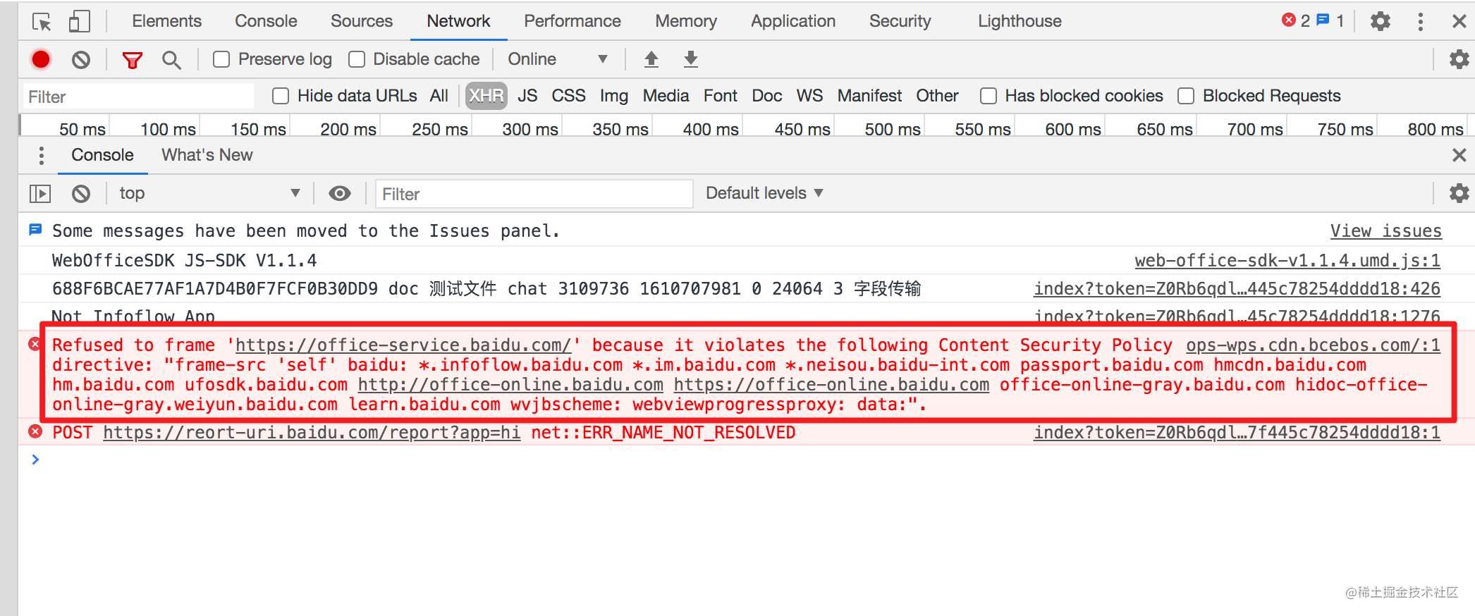1.打开控制台找到CSP报错2.读报错,明确是哪个域名何种类型的加载出了问题1.Refused to frame -> 加载iframe资源时出了问题,需要在frame-src中添加被拦截的域名2.Refused to load the script -> 加载js资源时出了问题 需要在script-src中添加被拦截的域名3…