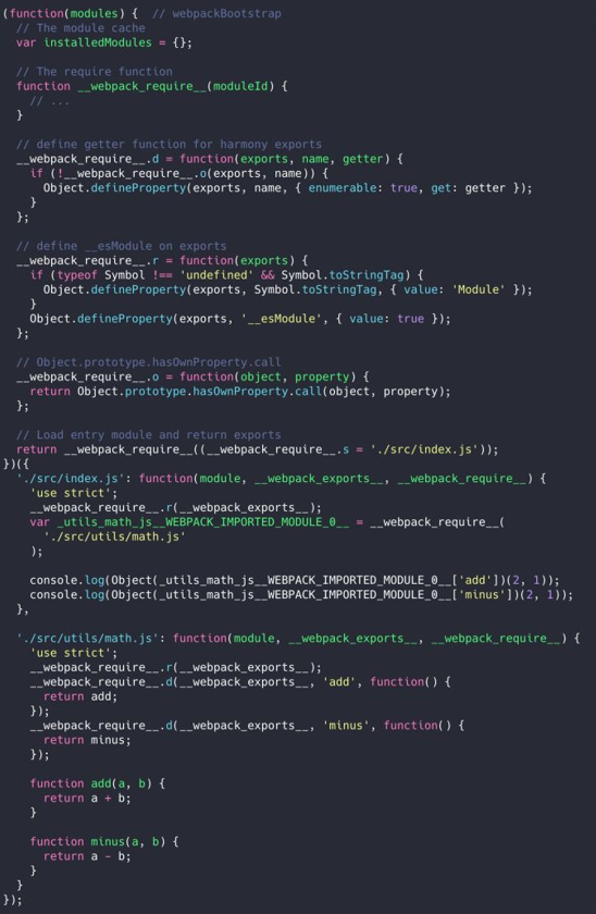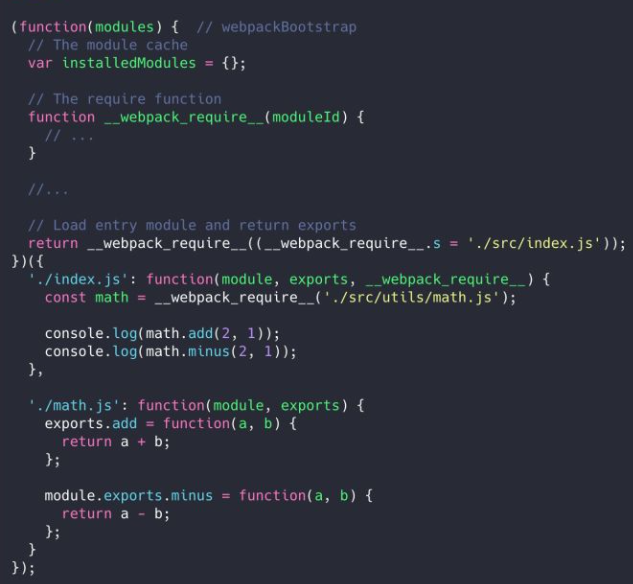 - 入口模块 index 函数:在 index.js 文件中,我们使用 require 来加载 math.js,而在 index 模块函数中,require 被转换成了 __webpack_require__,module、exports 和 __webpack_require__ 也都是通过模块函数参数传入的