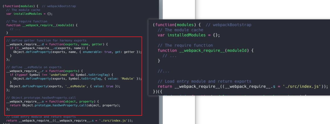 区别主要有两点: webpackBootstrap 中新增了一些函数定义;模块函数改动了一些内容。