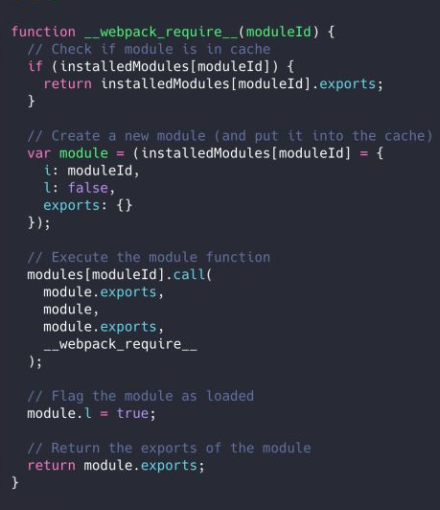 - 定义了一个模块加载函数 __webpack_require__,用来同步加载模块