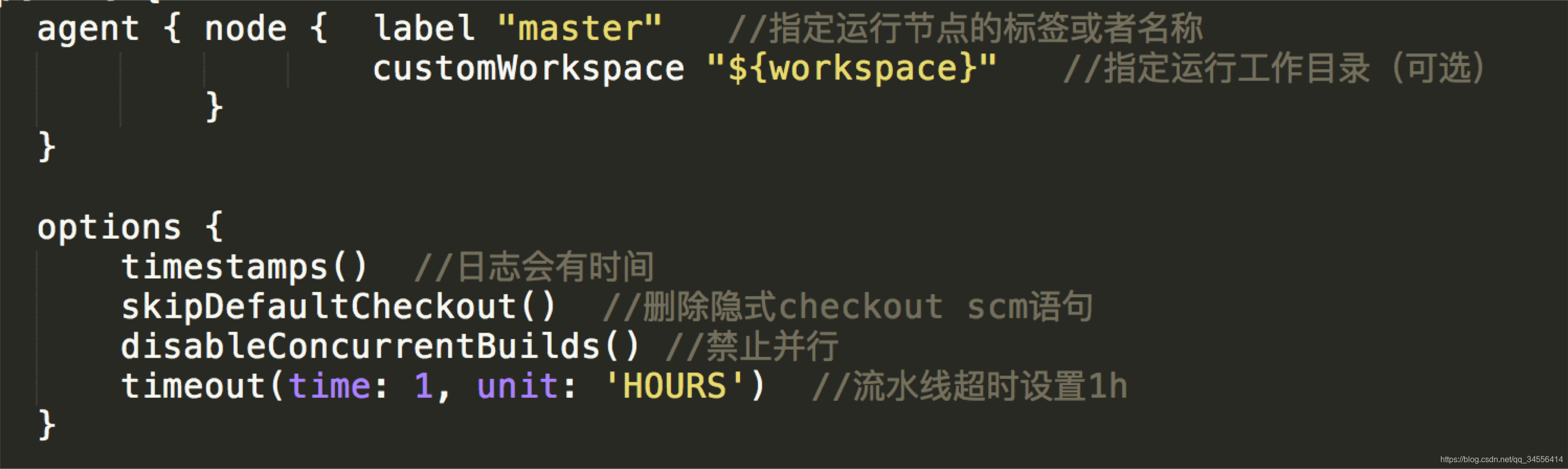 - 指定options{}运行选项(定义好此流水线运行时的一些选项,例如输出日志的时间)