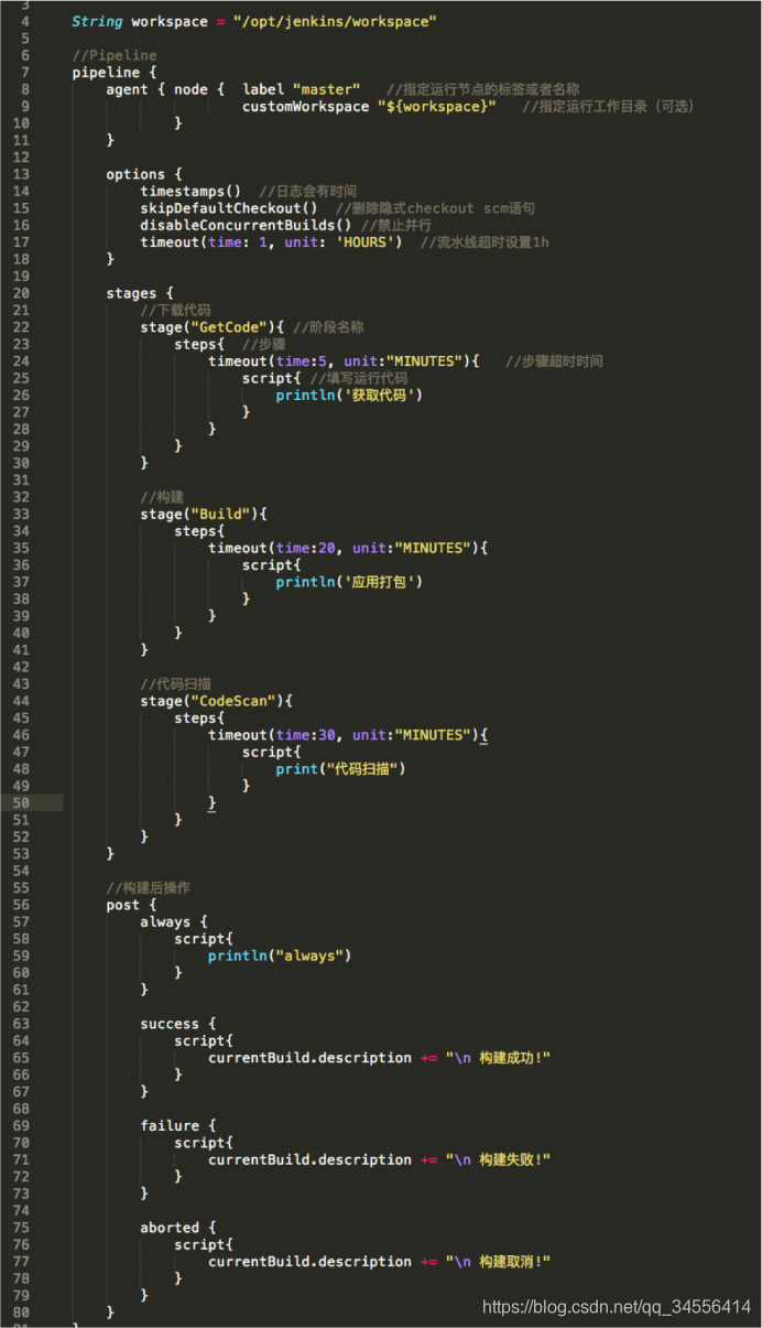 来我们一起看下这里的配置,看下Jenkinsfile的组成及每个部分的功能含义。
